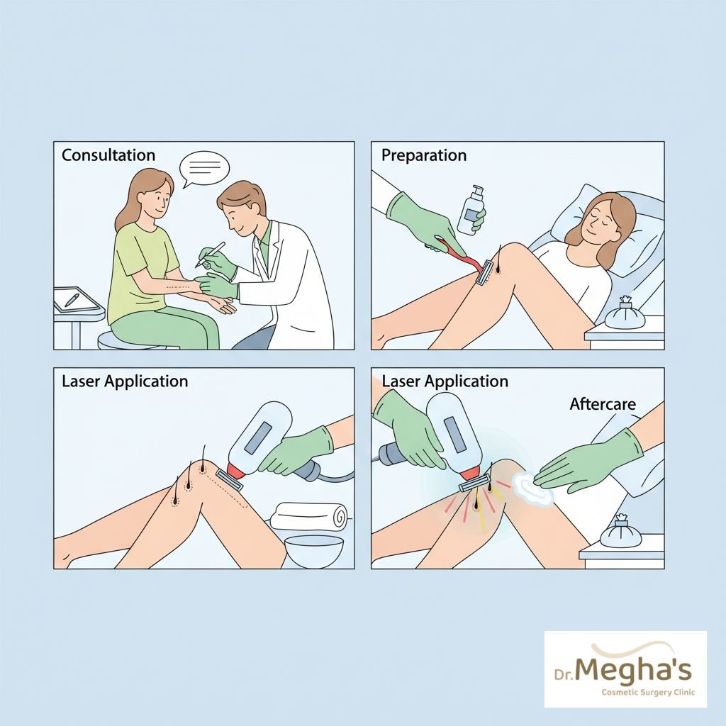 At Dr. Megha Cosmetic Surgery Hospital, multiple laser technologies are used depending on skin tone and hair type: